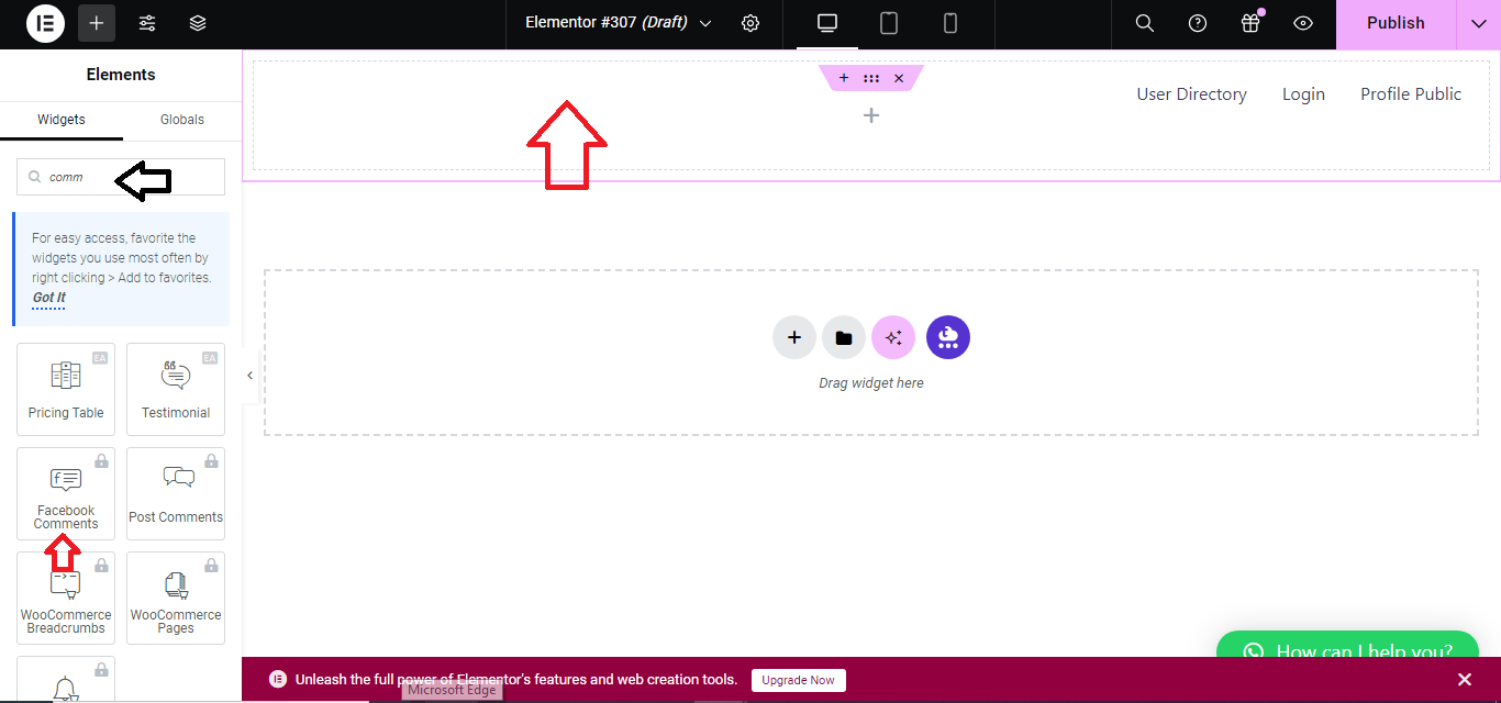 - In Elementor’s widget search bar, type “Facebook Comments.”