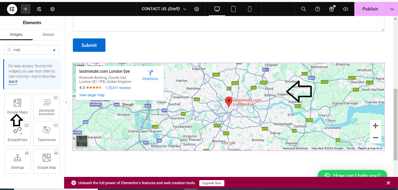 - In the Elementor panel on the left, search for Google Maps in the widget search bar.