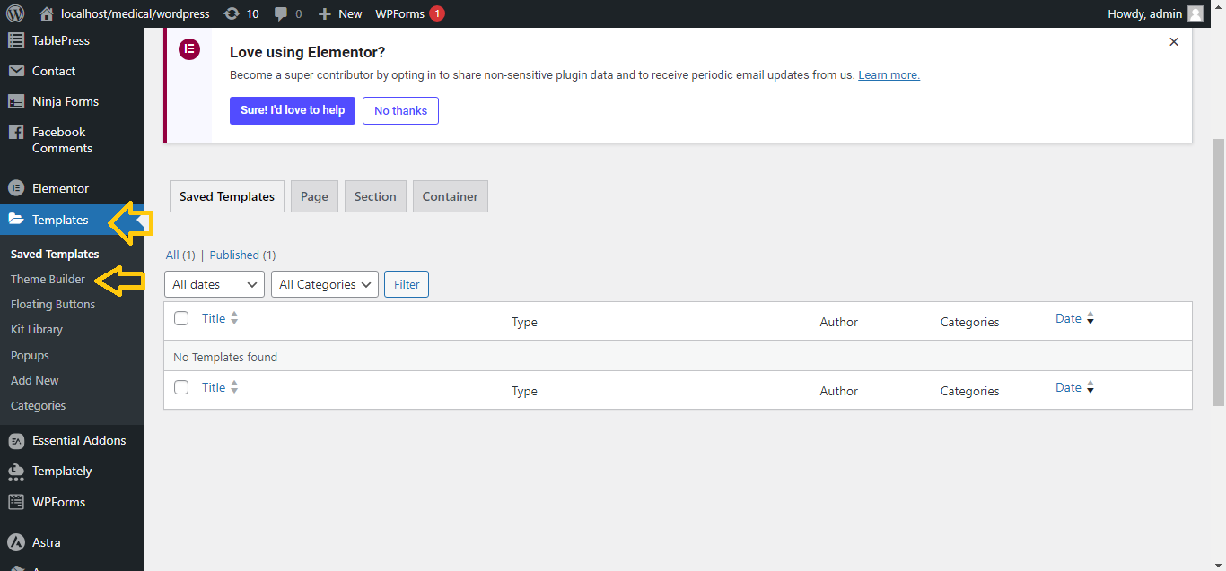 - In the WordPress dashboard, go to Templates > Theme Builder.