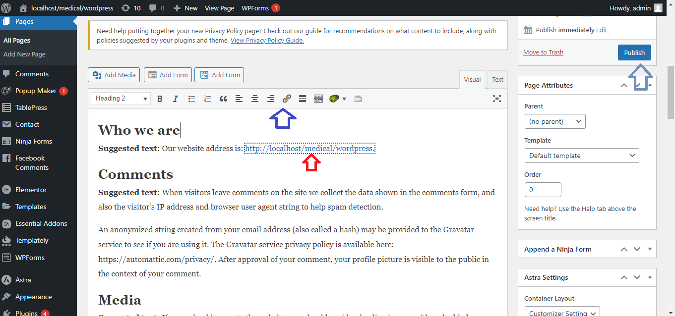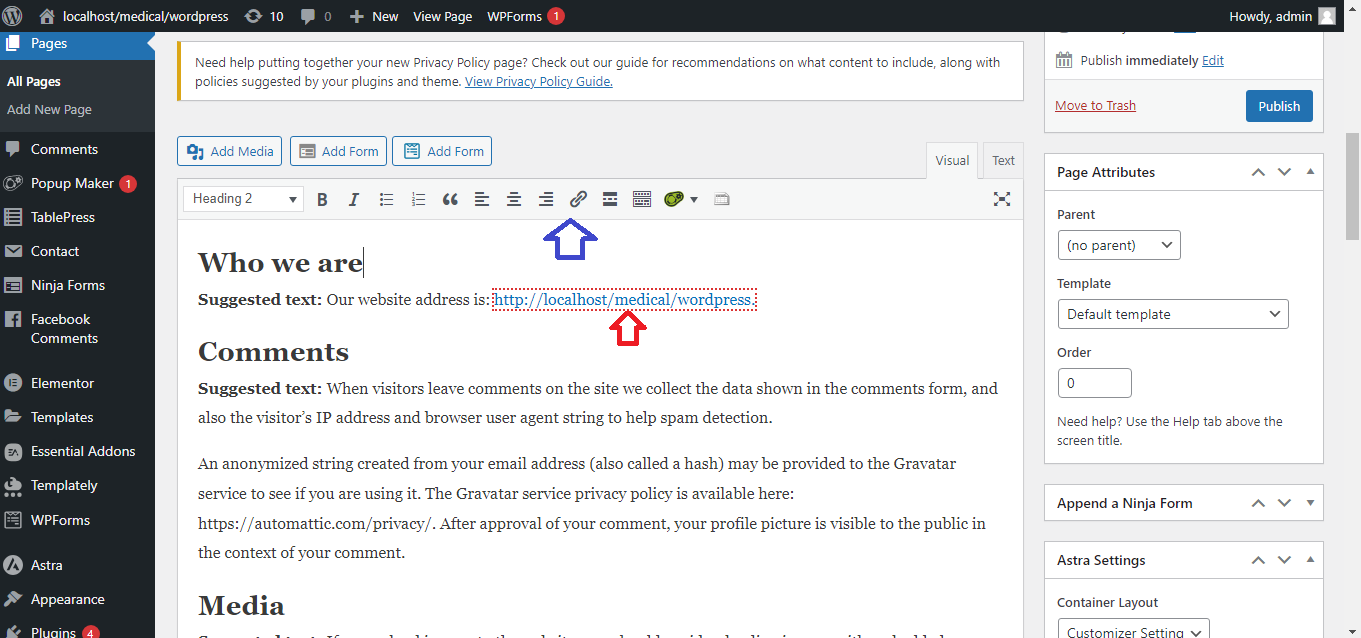- Highlight the text, click the link icon, and paste the URL of your Privacy Policy page.