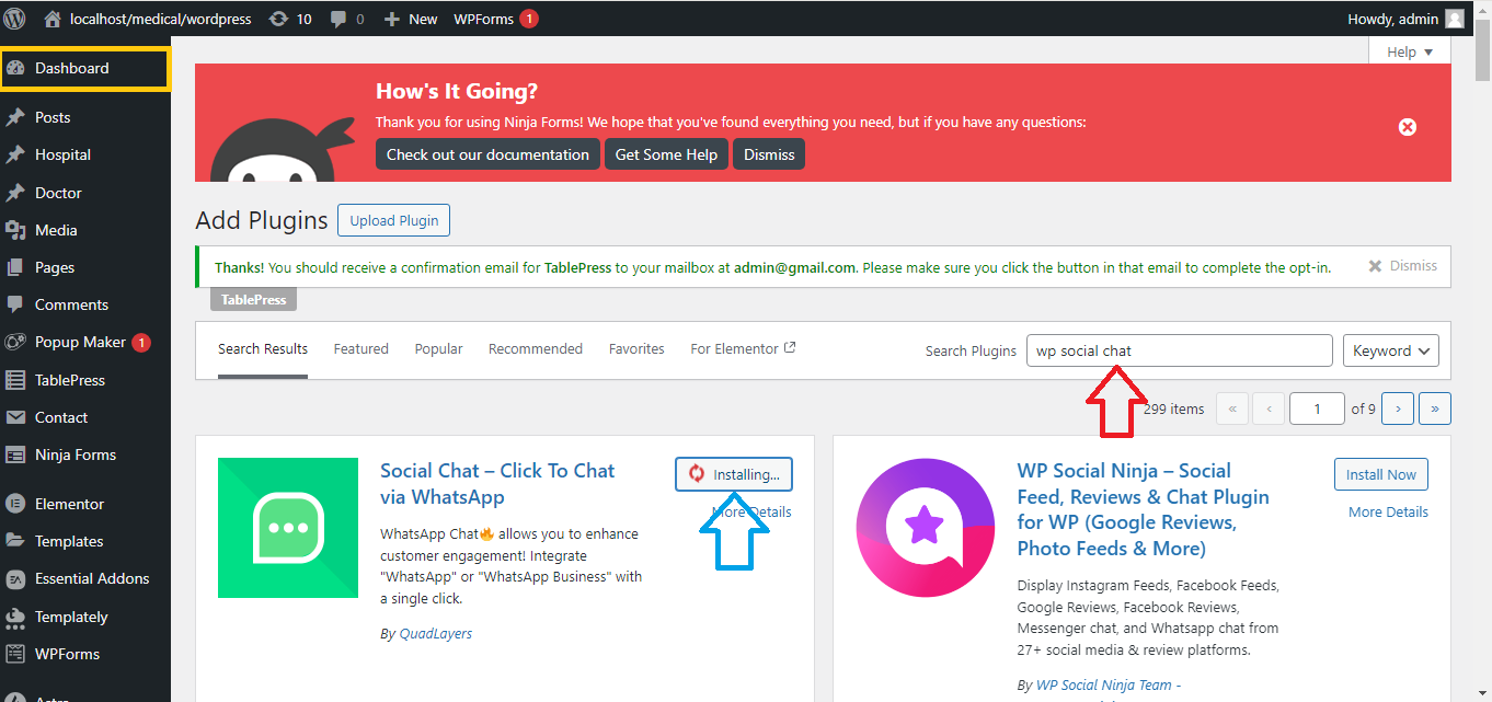 - In the search bar, type “WP Social Chat” or “Click to Chat“.