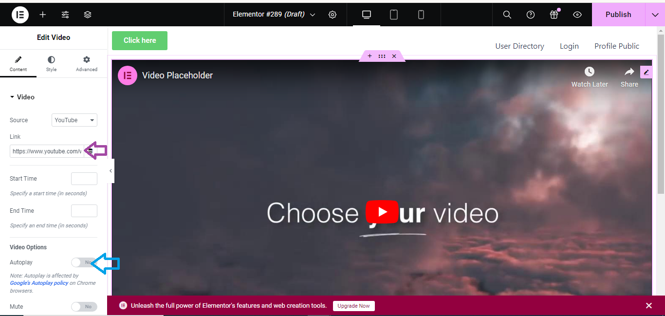- You can adjust settings like autoplay, loop, and mute under the Video settings.