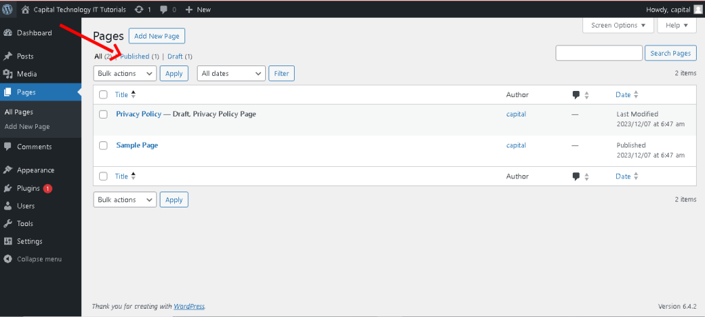 - In the “Pages” section, you can view all published, drafted, trashed, or scheduled pages.