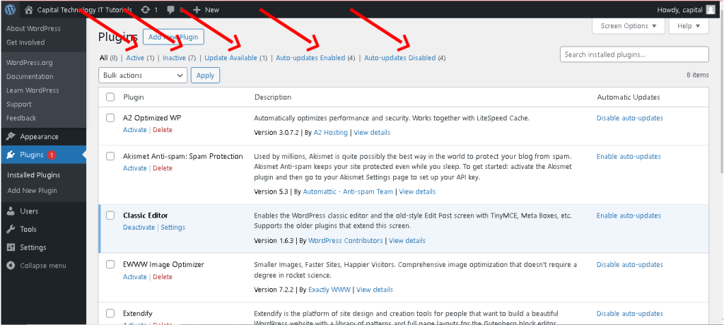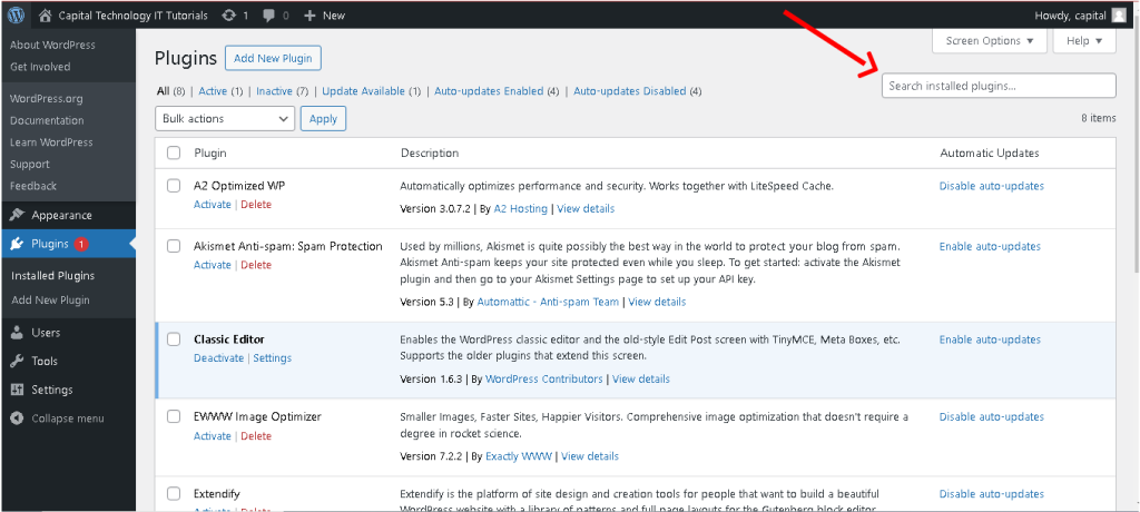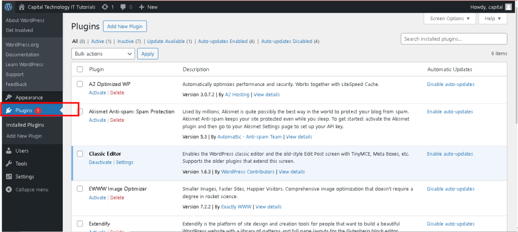 - In the “Plugins” section, you can view all installed plugins and their status activated or deactivated.