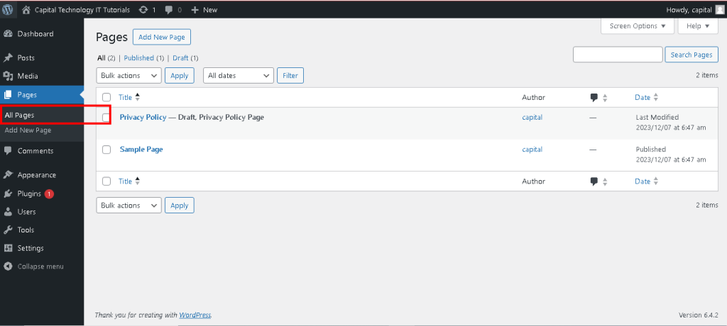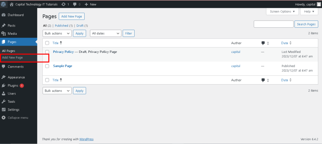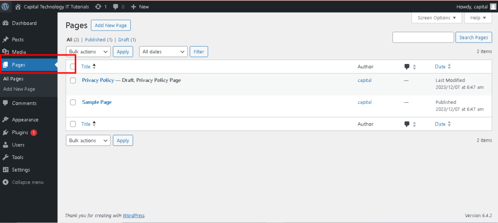 - To create a new page, go to “Pages” in the WordPress admin menu.