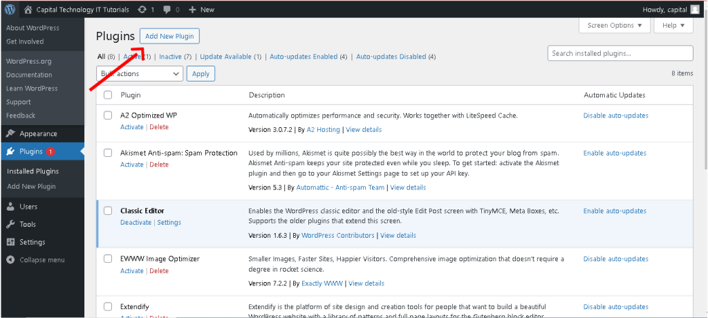 - Click on “Add New” to browse the WordPress Plugin Directory, where you can find thousands of free plugins.