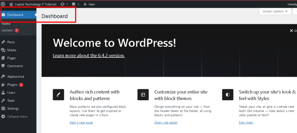 In WordPress, the dashboard is the first screen you see when you log in, providing an overview of your site’s activities and essential information. It serves as the central hub for managing your website. Here’s an overview of the dashboard sections: