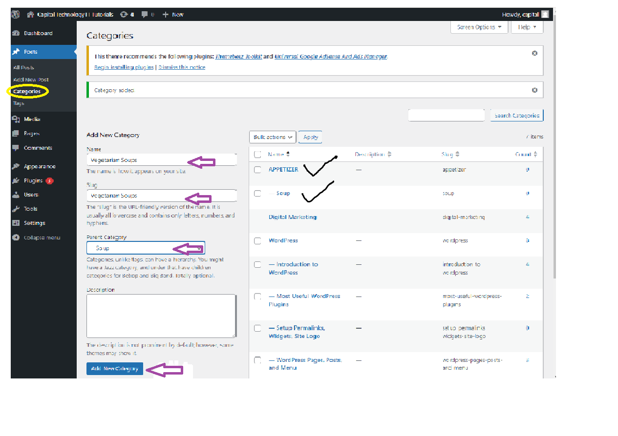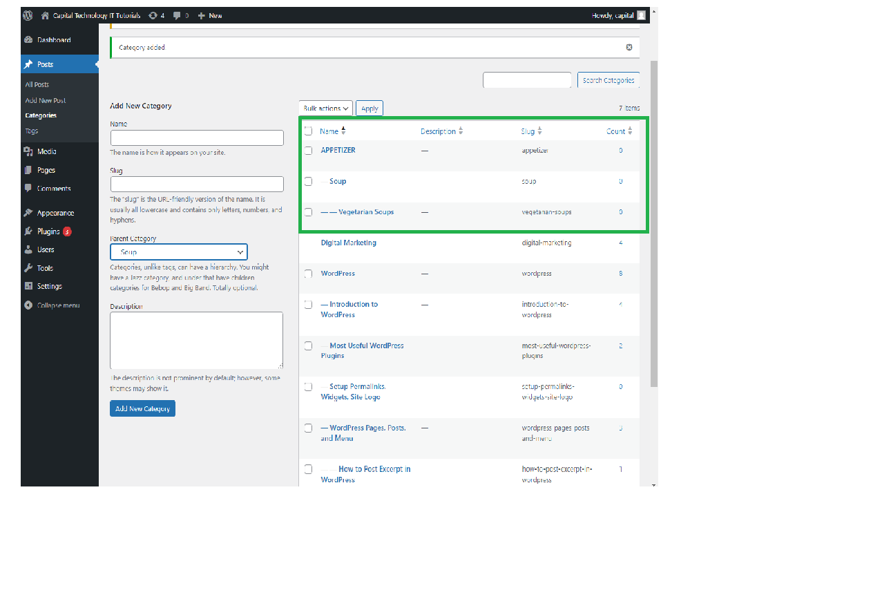 If you want to create a child category called “Vegetarian Soups” under a parent category called “Soups”:
