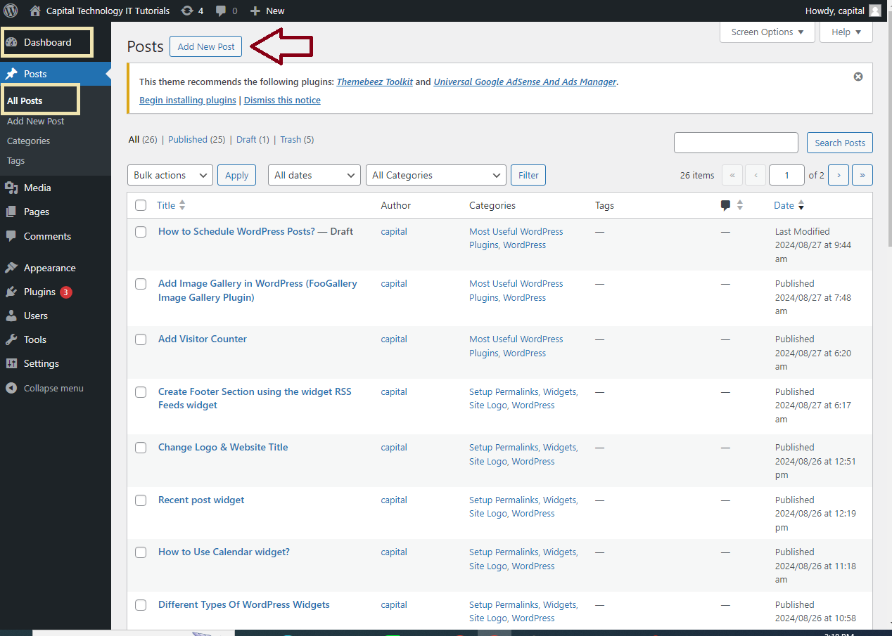 Posts>Add Newto create a new post.