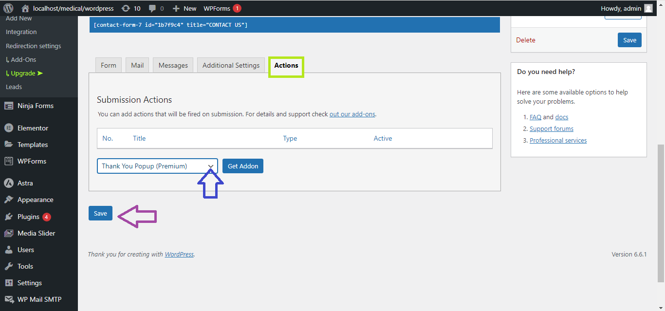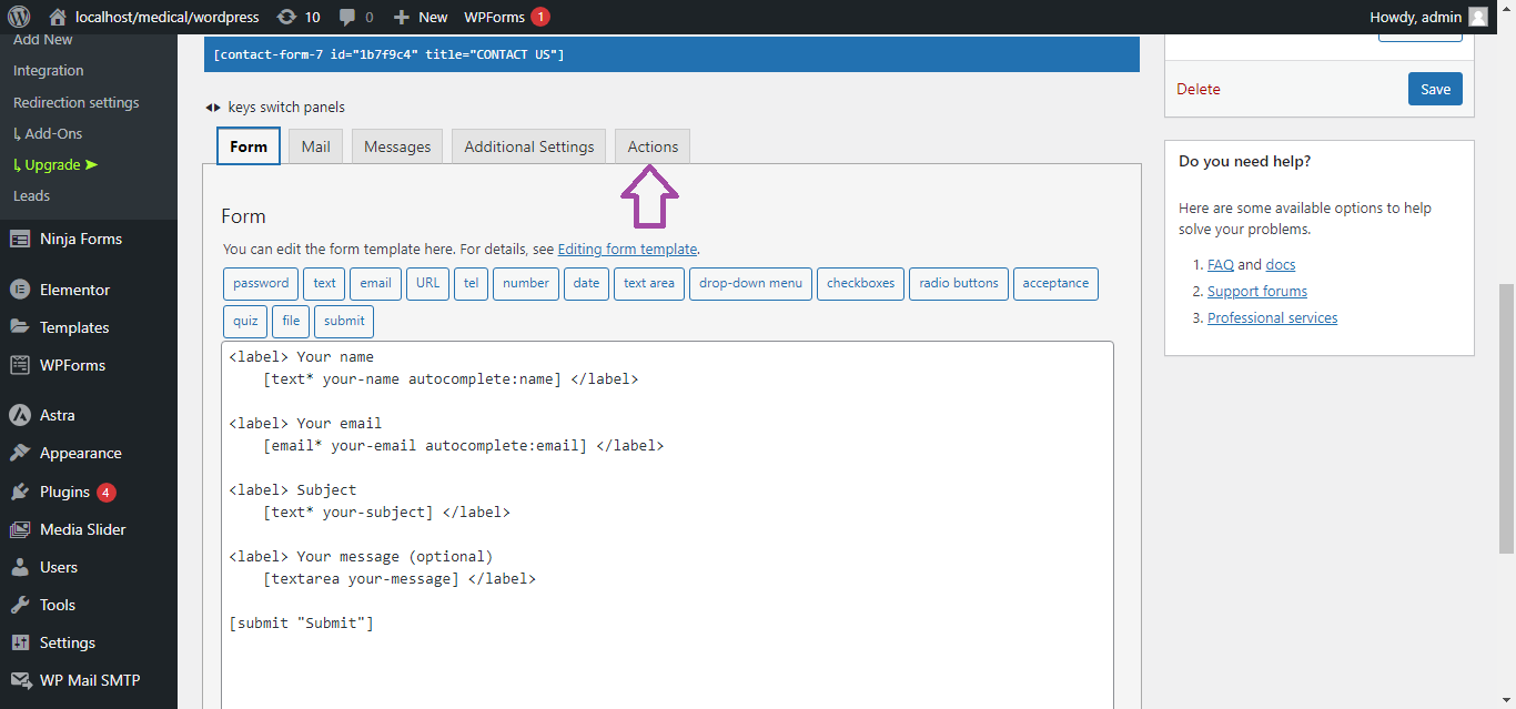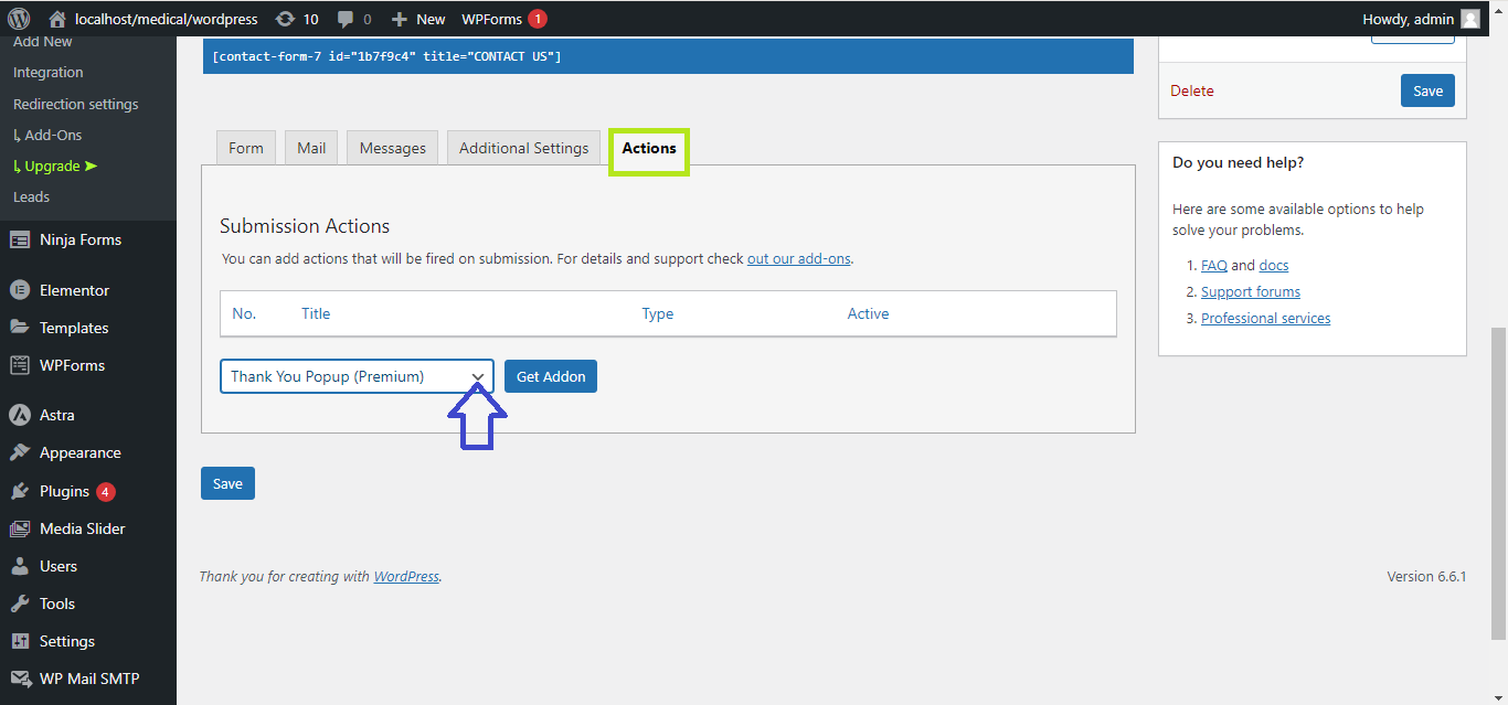 - Scroll down to the “Actions After Submission” section in the form editor (this section appears after installing the Redirection plugin).