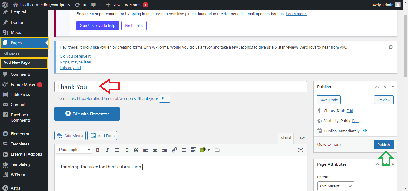 - Name the page (e.g., “Thank You”) and add a message thanking the user for their submission.